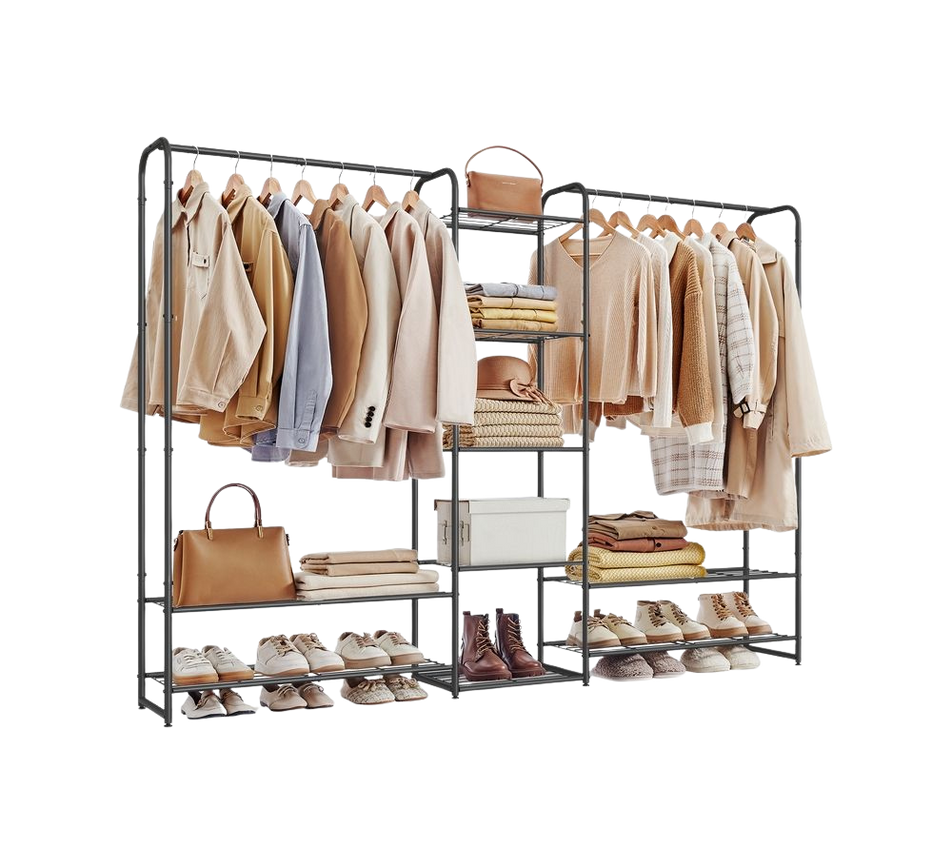 Stevig kledingrek met 110 kg draagvermogen, uitschuifbare stang en soepele wielen. Snel te monteren en geschikt voor elke ruimte.